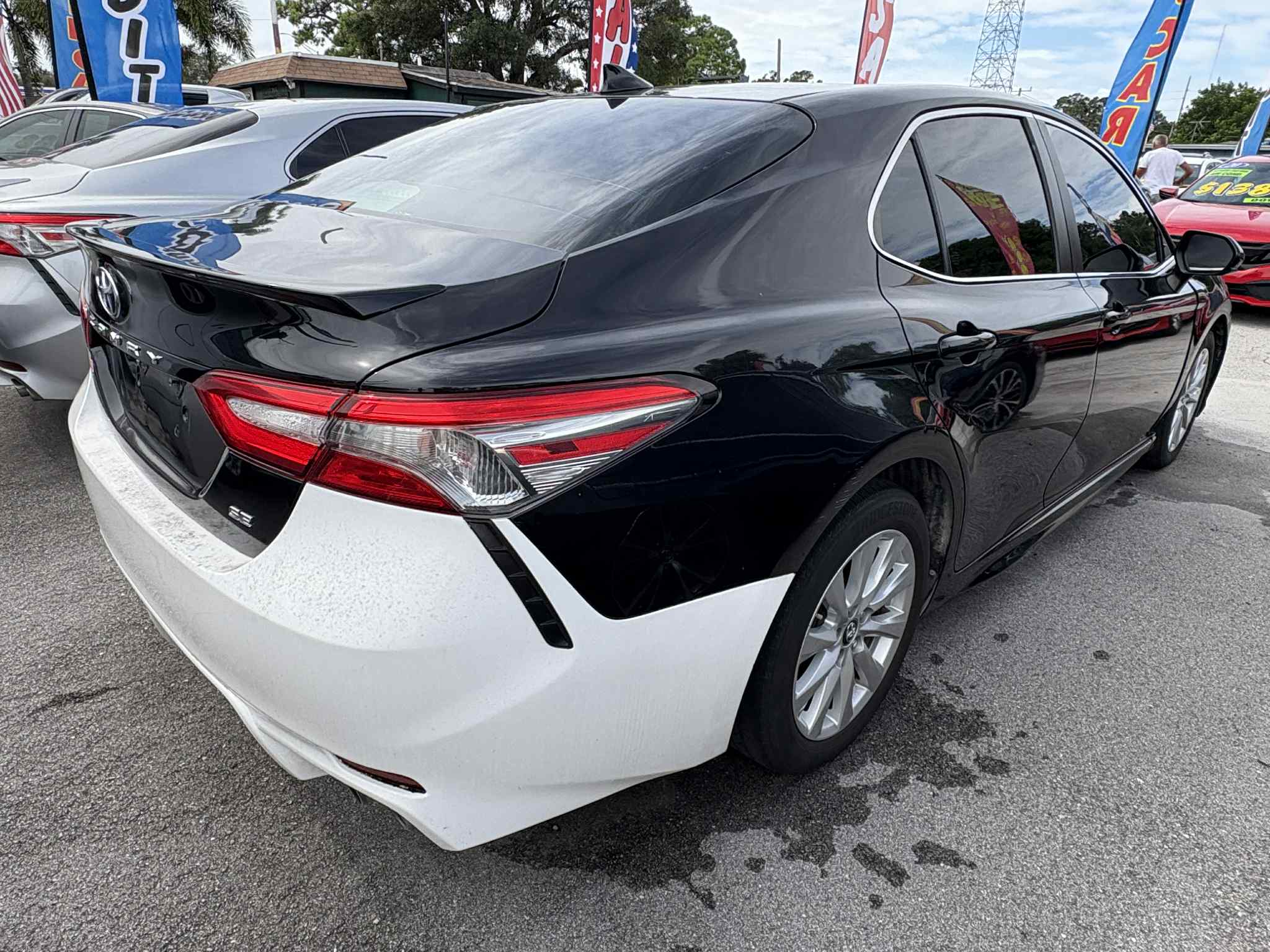 2019 Toyota Camry SE Fuel Economy City: 28 MPG Fuel Economy Highway: 39 MPG Air Conditioning: Air filtration Comfort Features: Armrests Convenience Features: Adaptive cruise control Instrumentation: Clock Seats: Driver seat power adjustments Powertrain: Battery Suspension: Front shock type Exterior Features:Door handle color:body-color, Exhaust:dual tip, Exhaust tip color:chrome, Front bumper color:body-color, Grille color:black, Mirror color:body-color, Rear bumper color:body-color, Rear spoiler:lip, Rear spoiler color:body-color, Rocker panel color:body-color, Window trim:chrome Lights:Daytime running lights:LED, Exterior entry lights:approach lamps, Headlights:auto delay off, Taillights:LED Mirrors:Side mirror adjustments:manual folding Wheels and Tires:Spare tire mount location:inside, Spare tire size:temporary, Spare wheel type:steel, Wheels:painted alloy Windows:Front wipers:variable intermittent, Laminated glass:acoustic, Power windows:safety reverse, Window defogger:rear Audio System:Antenna type:mast, Auxiliary audio input:Bluetooth, Internet radio app:iHeartRadio, Radio:AM/FM, Total speakers:6 In Car Entertainment:Connected in-car apps:Amazon Alexa, Infotainment:Entune, Infotainment screen size:7 in., Smartphone integration:Apple CarPlay Telematics:Driver assistance app:roadside assistance, Electronic messaging assistance:voice operated, Navigation app:Scout GPS Link, Navigation data:real time traffic, Phone:hands free, Smart device app function:vehicle location, Wifi:hotspot, Wireless data link:Bluetooth Driveline: FWD