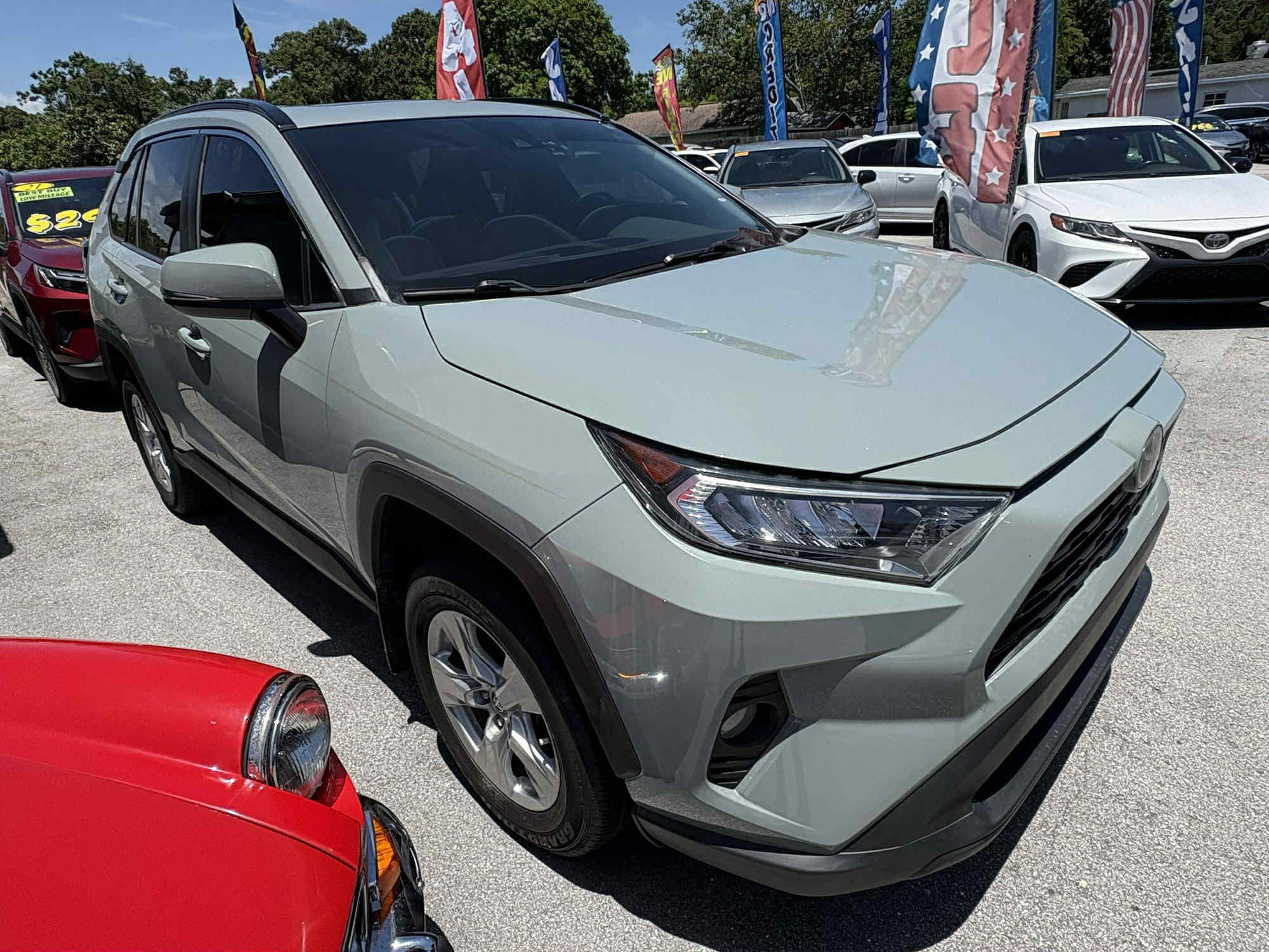 2020 Toyota RAV4 XLE Fuel Economy City: 27 MPG Fuel Economy Highway: 35 MPG Air Conditioning: Air filtration Comfort Features: Armrests Convenience Features: Adaptive cruise control Instrumentation: Clock Seats: Driver seat power adjustments Powertrain: Auxiliary transmission fluid cooler Suspension: Front shock type Exterior Features:Door handle color:body-color, Exhaust:dual tip, Exhaust tip color:chrome, Fender lip moldings:black, Front bumper color:body-color, Grille color:black, Headlight bezel color:chrome, Mirror color:body-color, Rear bumper color:black, Rear spoiler:roofline, Rear spoiler color:body-color, Rear trunk/liftgate:liftgate, Rocker panel color:black, Window trim:chrome Lights:Daytime running lights:LED, Exterior entry lights:approach lamps, Headlights:auto delay off, Taillights:LED Mirrors:Side mirror adjustments:manual folding, Side mirrors:heated Roof:Roof rails:black Wheels and Tires:Spare tire mount location:inside, Spare tire size:temporary, Spare wheel type:steel, Wheel spokes:5, Wheels:aluminum alloy Windows:Front wipers:variable intermittent, Liftgate window:fixed, Power windows:safety reverse, Rear wiper:auto-on in reverse, Window defogger:rear Audio System:Antenna type:diversity, Auxiliary audio input:Bluetooth, Radio:AM/FM, Satellite radio:SiriusXM, Total speakers:6 In Car Entertainment:Connected in-car apps:Amazon Alexa, Infotainment screen size:7 in., Smartphone integration:Android Auto Telematics:Driver assistance app:roadside assistance, Electronic messaging assistance:voice operated, Hands-free phone call integration:voice operated, Smart device app compatibility:Toyota Connected Services, Smart device app function:security event/collision alert, Wi-Fi:hotspot, Wireless data link:Bluetooth Driveline: FWD